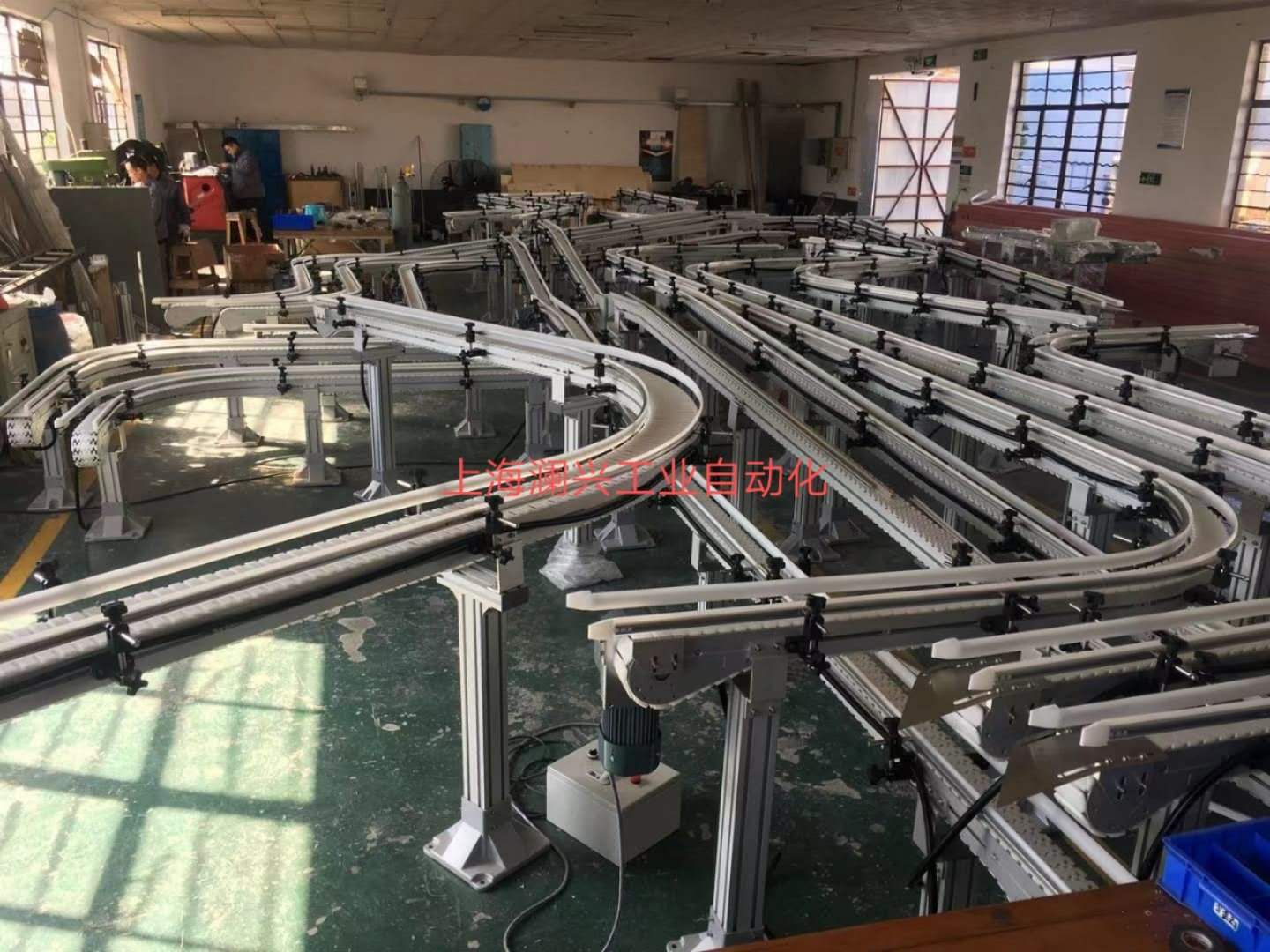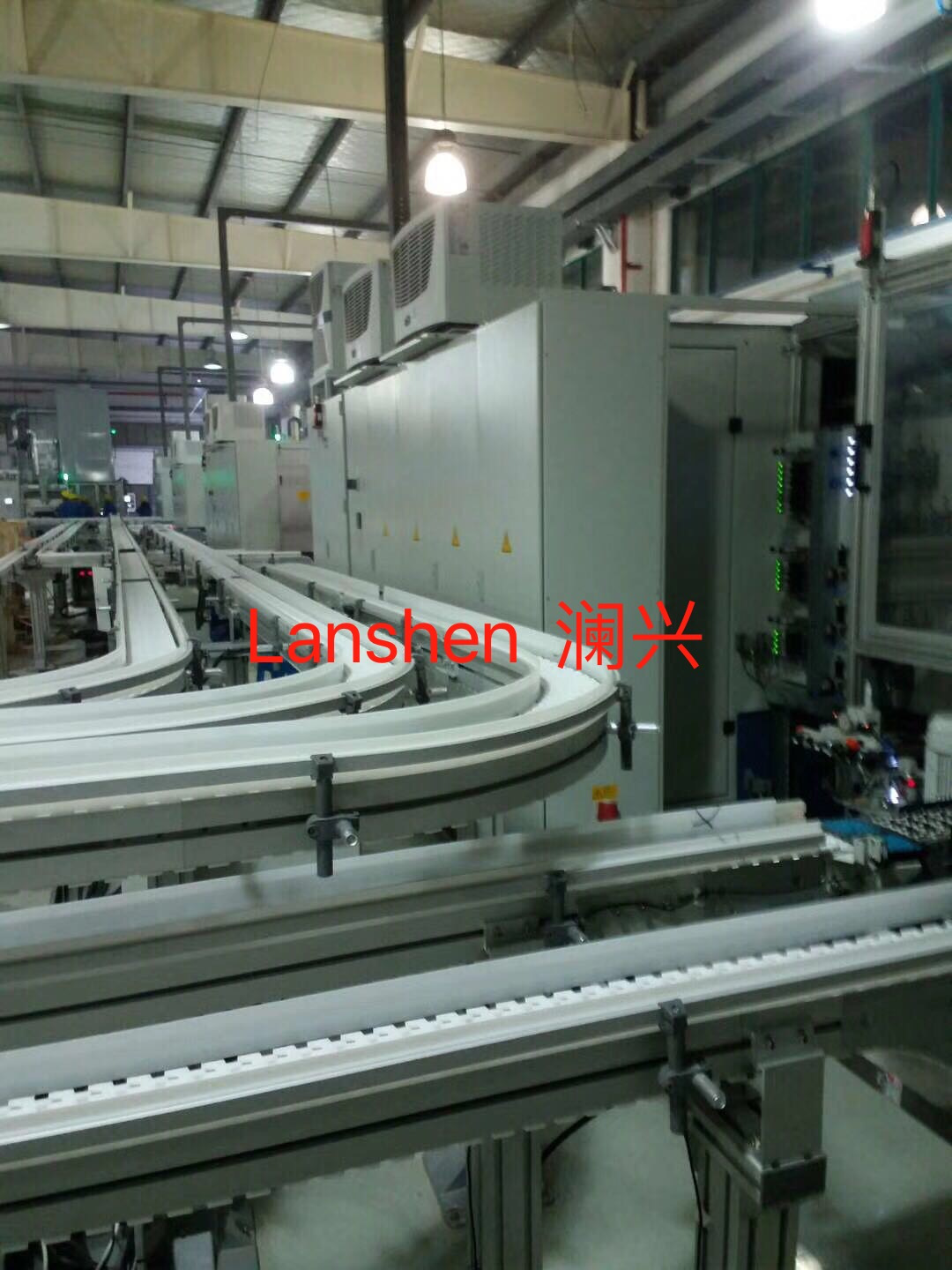 柔性輸送線(柔性輸送鏈)是一種由鋁型材制作而成的輸送梁,鋁型材制作的支撐腿,高壓壓鑄鋁驅(qū)動(dòng)模塊,轉(zhuǎn)彎鋁型材和鏈板構(gòu)成的一種輸送方式。由于輸送梁和支撐腿等部件均為是鋁型材,便于快速切割,易于可長(zhǎng)可短,可高可低,同時(shí)鋁材便于彎曲,在安裝現(xiàn)場(chǎng)便于直接修改長(zhǎng)短和線體的高低,鋁型材重量較輕,工作人員工作強(qiáng)度較小,便于制作出我們需要的輸送線體路徑,所以稱之為柔性輸送線。
